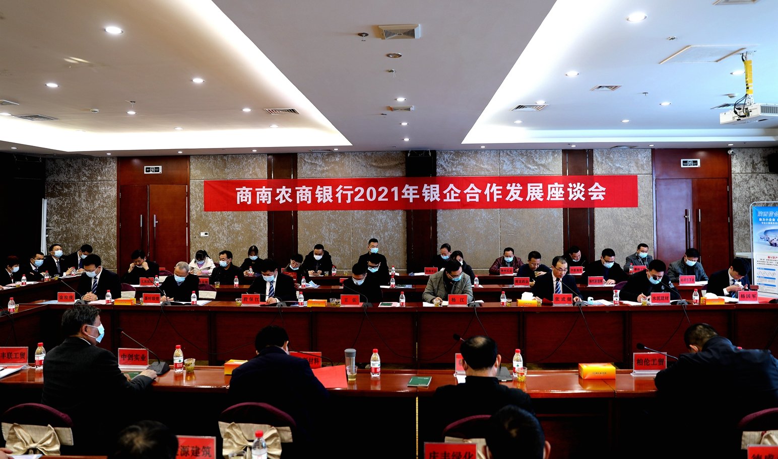 1月14日,商南农商银行召开2021年银企合作发展座谈会。商南农商银行全体班子成员段保江、张成健、金栓俊、杨国军及部室负责人、营业部客户经理与50余家企业界代表一起座谈。商南县政府副县长王佐、人行商南支行长杨江莅临会议并讲话。座谈会由商南农商银行党委委员、副行长杨国军主持。