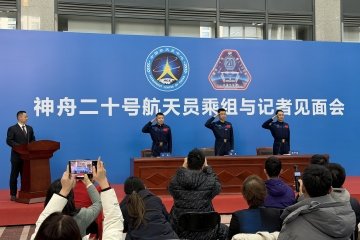 2026年1月16日,中国航天员科研训练中心在北京航天城举行神舟二十号乘组与记者见面会。这是神舟二十号航天员陈冬、陈中瑞和王杰“换乘”神舟二十一号飞船返回63天后,首次面向媒体与公众正式公开亮相,就太空驻留期间的工作感悟,和舷窗遭遇空间碎片撞击后的应急处置过程答记者问。