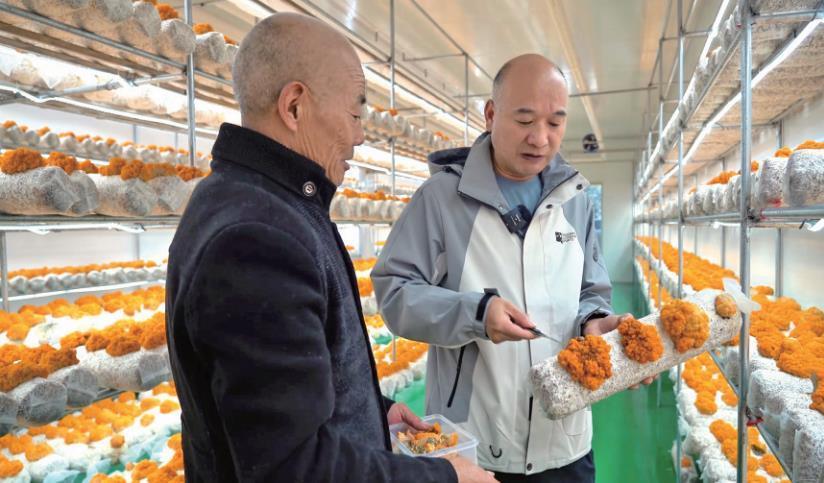 1月15日,在柞水县山城美农生态农业科技有限公司金耳种植区,公司负责人陈盛林(右)查看金耳生长情况。 本报通讯员 李沁杰摄