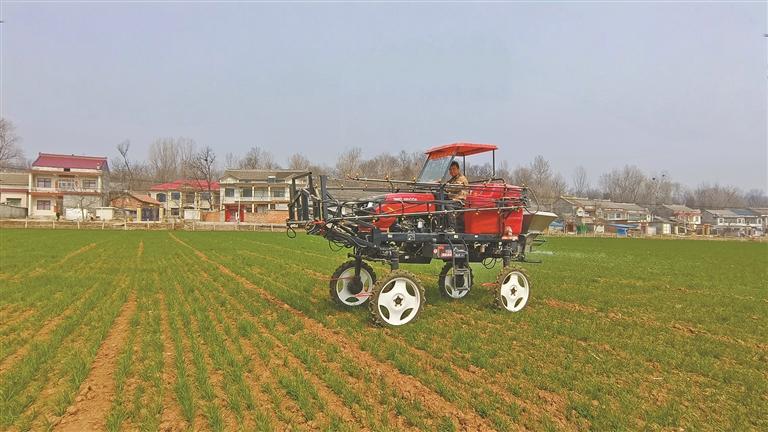三月十七日,洛南县雄风农机专业合作社社员利用自走式喷杆喷雾机对麦田开展追肥作业。 本报通讯员 毕波波摄