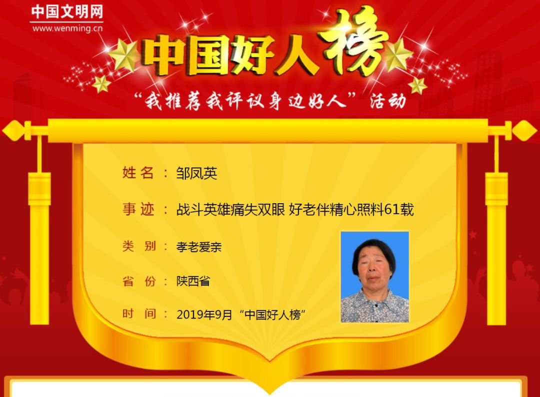 商洛新闻网讯:9月27日,中央文明办在陕西省铜川市举办9月中国好人榜发布仪式暨全国道德模范与身边好人现场交流活动,来自商洛市柞水县营盘镇营镇社区二组的居民邹凤英荣登孝老爱亲类“中国好人榜”。一起来了解她的感人故事!